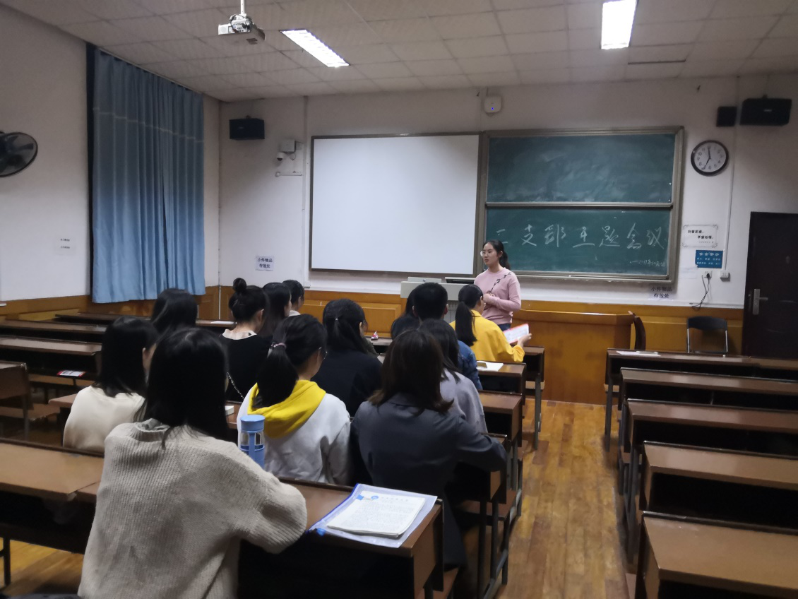 支部书记兰岚首先对“不忘初心、牢记使命”主题教育党课进行讲话。她着重提出支部成员加强思想理论建设的重要性,强调要深入学习贯彻习近平总书记关于“不忘初心,牢记使命”系列讲话,切实推动习近平新时代中国特色社会主义思想往深里走、往心里走、往实里走。关于如何践行初心和使命,兰岚书记认为作为学生,更应该把成才报国的理想信念写在具体行动上,在学业上下“实功夫”,取得一番成绩。