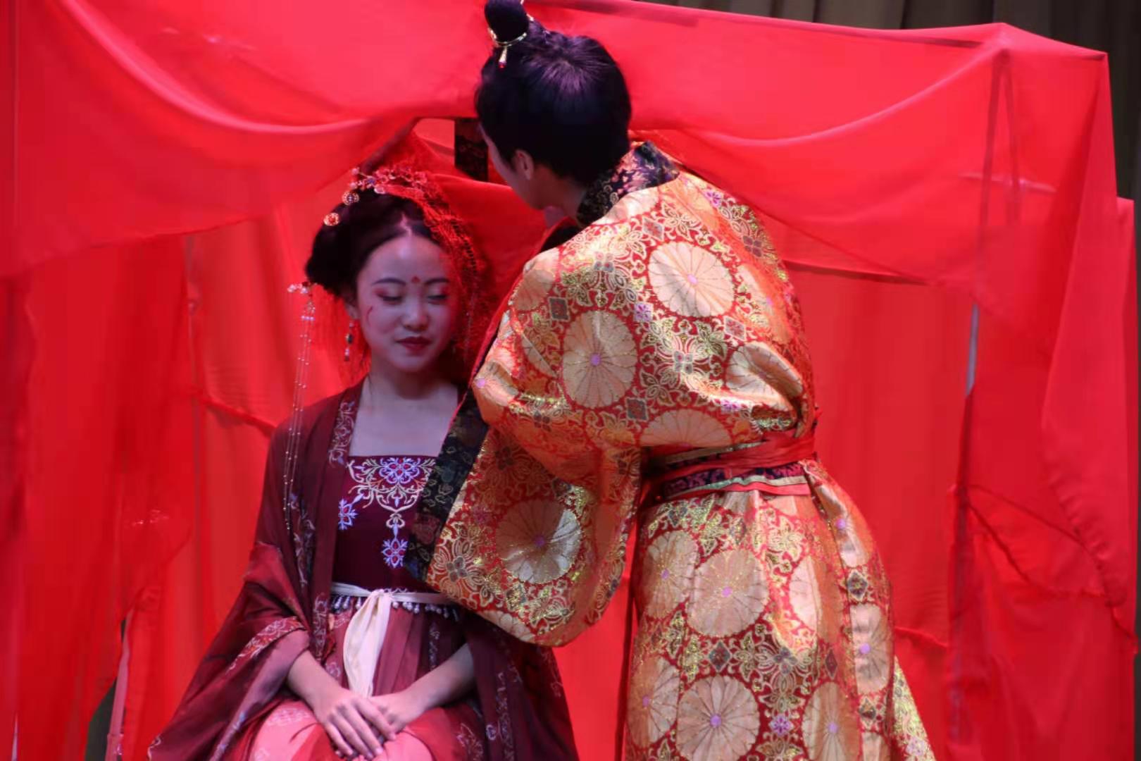 “不,成长不是固步自封,沉溺于曾经的美好梦乡里。这条路注定不平坦,从来都是艰险坎坷的。从今往后我不要做被圈养在温室里嗷嗷待哺的羊,不要只做曾经那个只会逃避,充满幼稚幻想可笑的自己!”舞台上,借助独特的戏剧表现手法,唐高宗李治与过去的自己对话,道出成长路上的勇气与决心,将剧目推向了高潮。