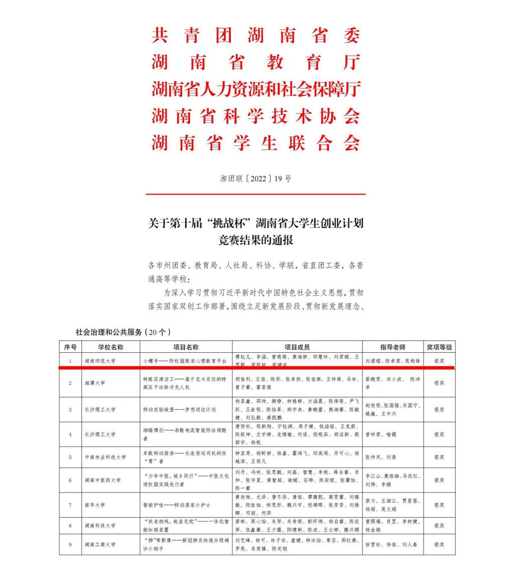 通讯员(黄海妍 傅钰儿)在校团委、学院领导老师的关心支持与指导帮助下,永利集团3044官网欢迎您“小螺号——防校园欺凌心理教育平台”项目团队全力备赛,经过院、校、省层层选拔后,项目组冲出重围,荣获2022年永利集团3044官网欢迎您“挑战杯”大学生创业计划竞赛一等奖、第十届“挑战杯”湖南省大学生创业计划竞赛银奖。