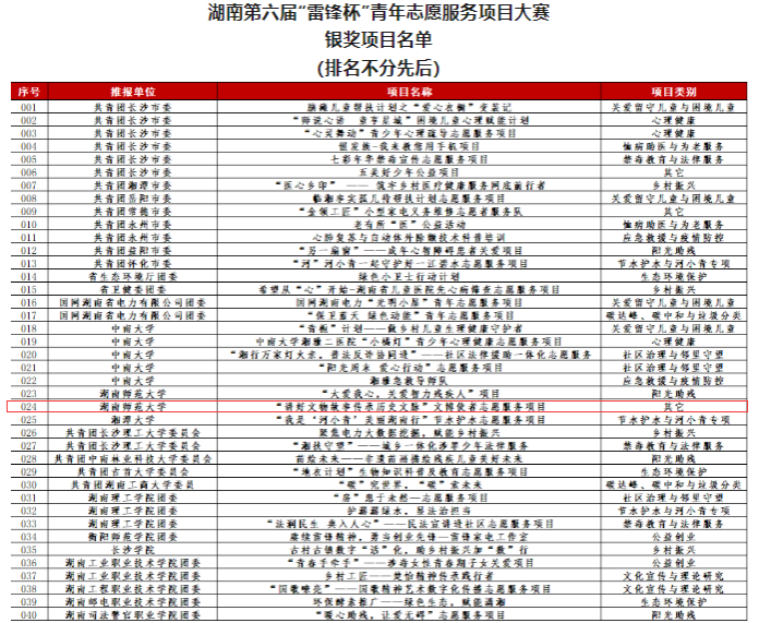 (通讯员 陈卓君 马文静)2023年9月21日,由共青团湖南省委、湖南省文明办等部门联合举办的“志愿新湖南 奋进新征程”湖南省第六届“雷锋杯”青年志愿服务项目大赛评审结果揭晓。通过初赛、复赛、决赛,经省内外专家评委评审和线上答辩,最终永利集团3044官网欢迎您团委“文博使者”志愿服务项目从报名的1116个项目中脱颖而出,荣获湖南省第六届“雷锋杯”青年志愿服务项目大赛银奖。